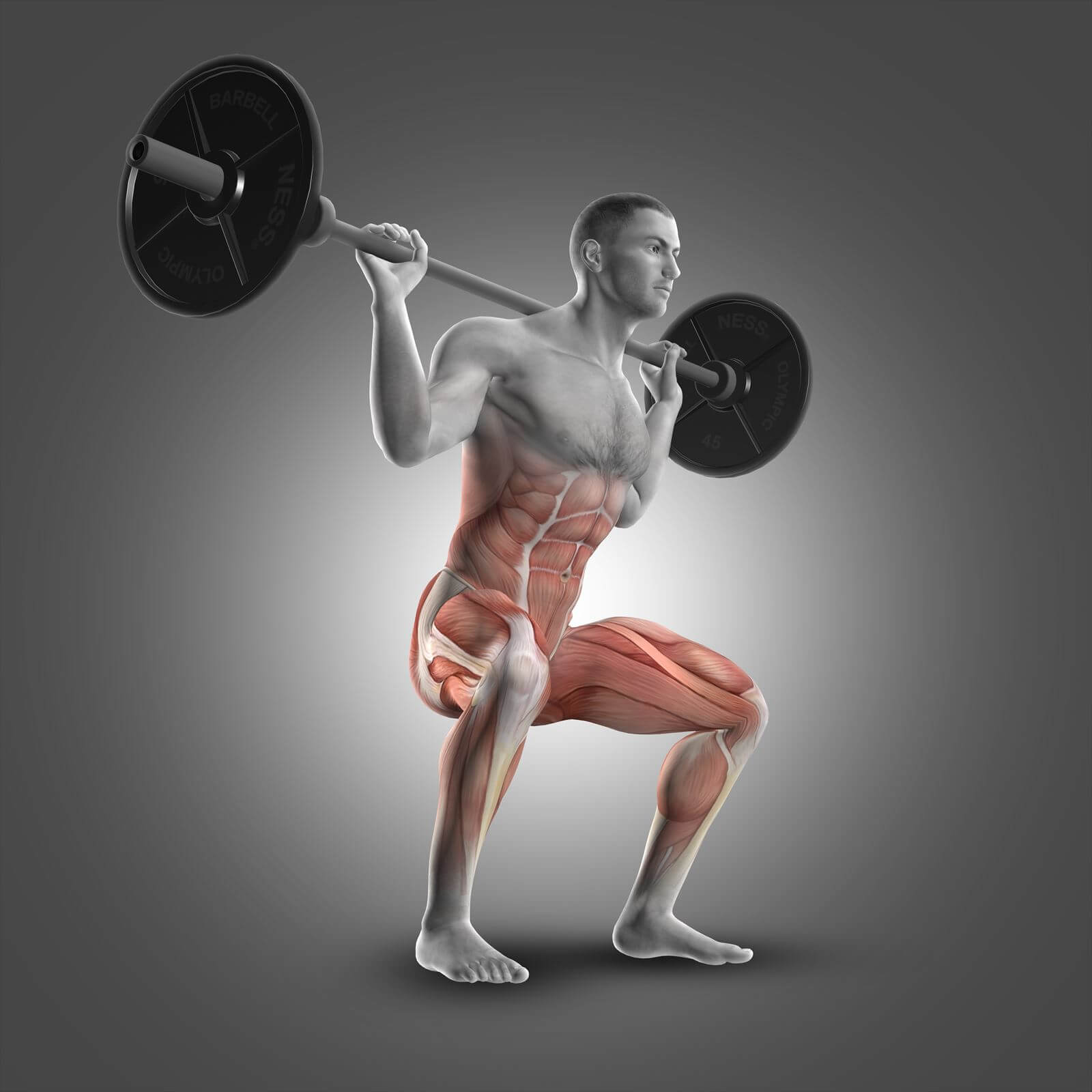 3D render of a male figure in a barbell squat highlighting the muscles usedDesigned by Kjpargeter